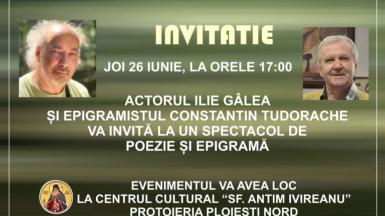 Actorul Ilie Gâlea și epigramistul Constantin Tudorache vă dau întâlnire la un eveniment cultural deosebit, dedicat iubitorilor de epigrame și poezie. Spectacolul va avea loc la Centrul Cultural “Sf. Antim Ivireanu”, din cadrul Protoieriei Ploiești Nord. Această întâlnire...