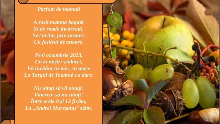 În fiecare an, pe măsură ce toamna își face simțită prezența și copacii își schimbă culoarea frunzelor, comunitatea Școlii Gimnaziale “Andrei Mureșanu” din Municipiul Ploiești se adună pentru a sărbători Ziua Educației printr-un eveniment cu totul special – Târgul de...