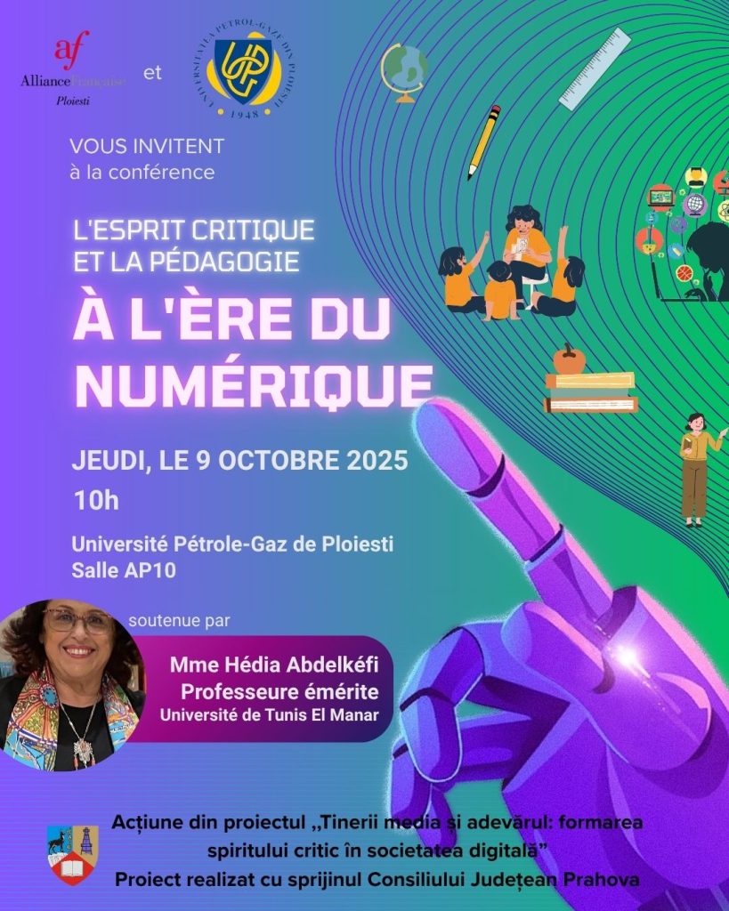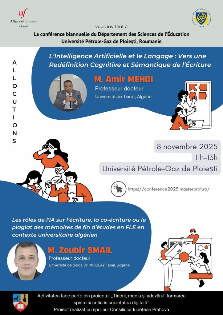 Alianţa Franceză din Ploieşti a fost din nou partenerul Departamentului Științele Educației de la Universitatea Petrol-Gaze din Ploiești, în organizarea conferinţei lor ştiinţifice bi-anuale, Invitaţii Alianţei Franceze au fost doi profesori doctori specialişti în comunicare şi în didactica predării limbii franceze. Menţionăm titlurile prelegerilor lor : Prof. dr. Amir Mehdi, Universitatea din Tiaret, Alger, Algeria a susţinut prelegerea ” L’Intelligence artificielle et le langage : vers une redéfinition cognitive et Sémantique de l’écriture”, iar Prof. dr. Zoubir Smail, Universitatea Saida Dr. MOULAY din Tahat, Algeria :” Les rôles de l’IA sur l’écriture, la co-écriture ou le plagiat des mémoires de fin d’études en FLE en contexte universitaire”.