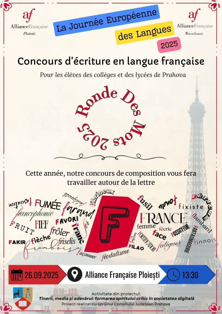 Fidelă rolului său cultural, misiunii de a difuza limba franceză, ca limbă de promovare a valorilor umaniste europene, Alianța Franceză Ploiești, a organizat în cadrul proiectului două concursuri dedicate valorizării abilităților lingvistice ale elevilor din școlile partenere, abilităţi exersate pe tematica proiectului, educaţia media : La Ronde des Mots (26 septembrie 2025), și Lire en fête (25 octombrie 2025).
