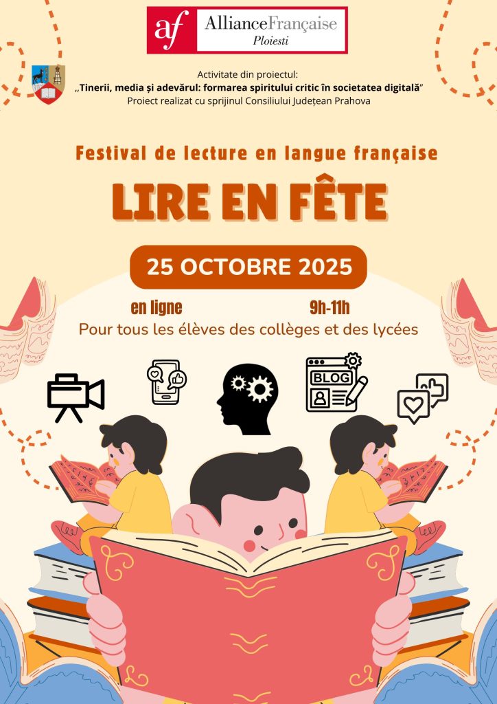 Festivalul-concurs Lire en fête este organizat de către Alianţa Franceză din Ploieşti în fiecare an, din 1994, când evenimentul a fost lansat de Ministerul Culturii din Franţa, la nivel mondial. Desfăşurat şi anul acesta în mediul online, evenimentul s-a bucurat de participarea a peste 1300 de elevi care și-au dovedit abilitățile de a citi în mod fluent, expresiv și personal, texte în limba franceză, atent selecţionate pe tema educaţiei pentru un consum responsabil al informaţiilor media. Au participat elevi din 76 scoli din judeţul Prahova, pregătiţi şi coordonaţi de 119 profesori de limba franceză. Participarea numeroasă a publicului şcolar şi la această ediție atestă faptul că lectura ca manieră de explorare a limbii nu este doar o pasiune, ci și o asumare, o responsabilizare care vine din studiul și însușirea unei alte limbi.