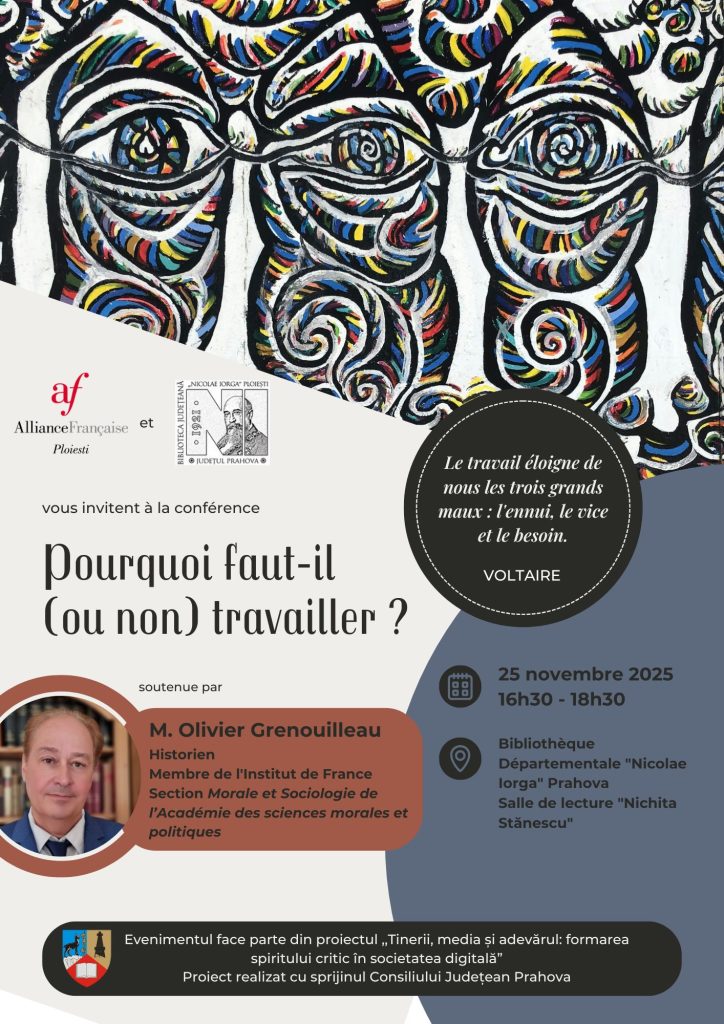 ȋn încheierea activităţilor din proiectul nostru, în ziua de 25 noiembrie, în parteneriat cu Biblioteca Judeţeană Nicolae Iorga, Alianţa Franceză invită publicul interesat şi profesorii din judetu Prahova la conferinţa intitulată „Pourquoi faut-il (ou non) travailler ?”, susţinută de prof. dr. Olivier Grenouilleau, istoric, cercetător de renume mondial în istoria şi evoluţia umanităţii. Dl Olivier Grenouilleau a fost elogiat şi admis ca academician, în septembrie 2025, membru titular al secţiunii Morale et Sociologie de l’Académie des sciences morales et politiques al prestigiosului INSTITUT DE FRANCE. Conferinţa poartă mesajul depre muncă, sursa de dezvoltare personală şi socială, de-a lungul istoriei umanităţii. Munca îl ferește pe om de toate cele rele, precum plictisul, viciul şi nevoia : „Le travail éloigne de nous les trois grands maux : l’ennui, le vice et le besoin.” (Voltaire).